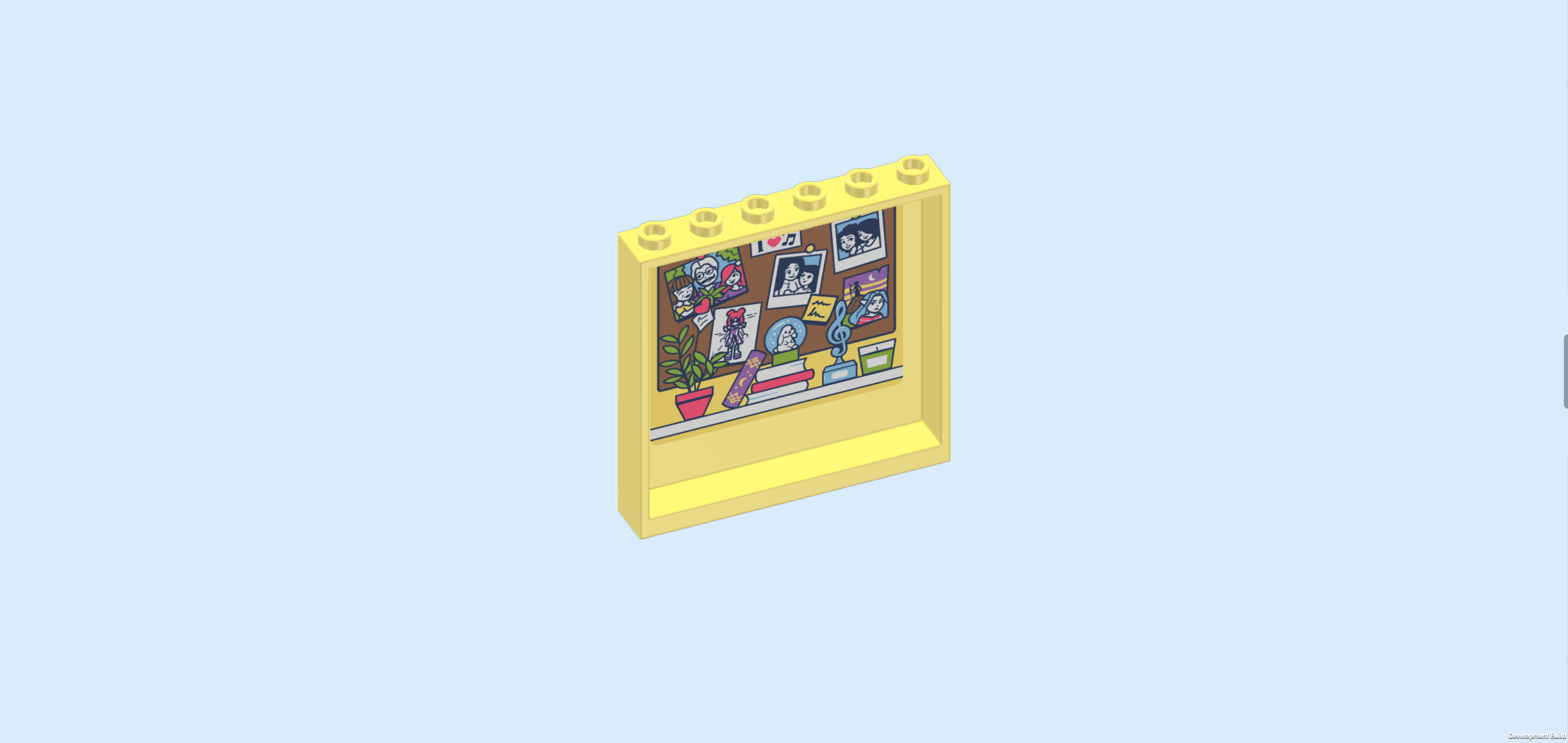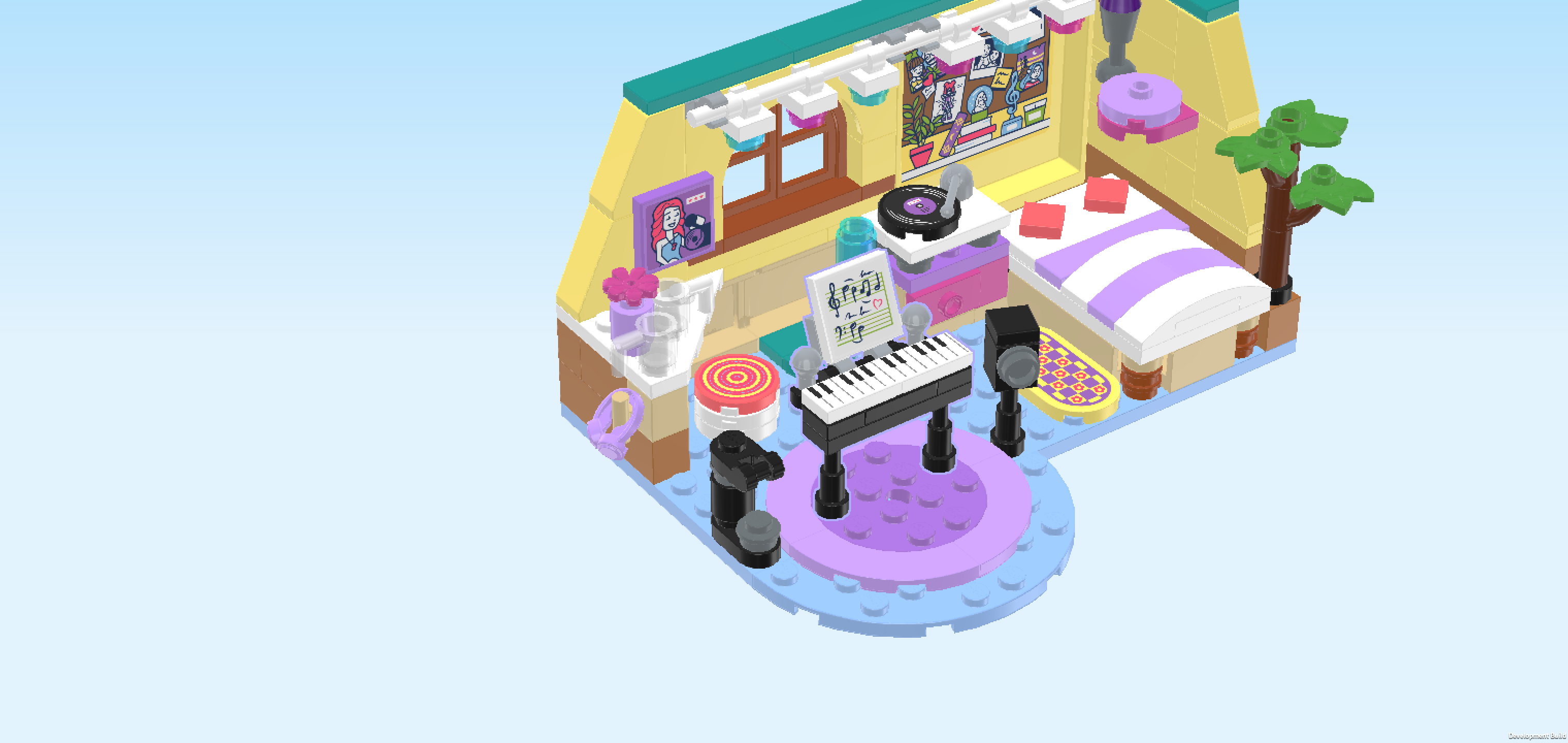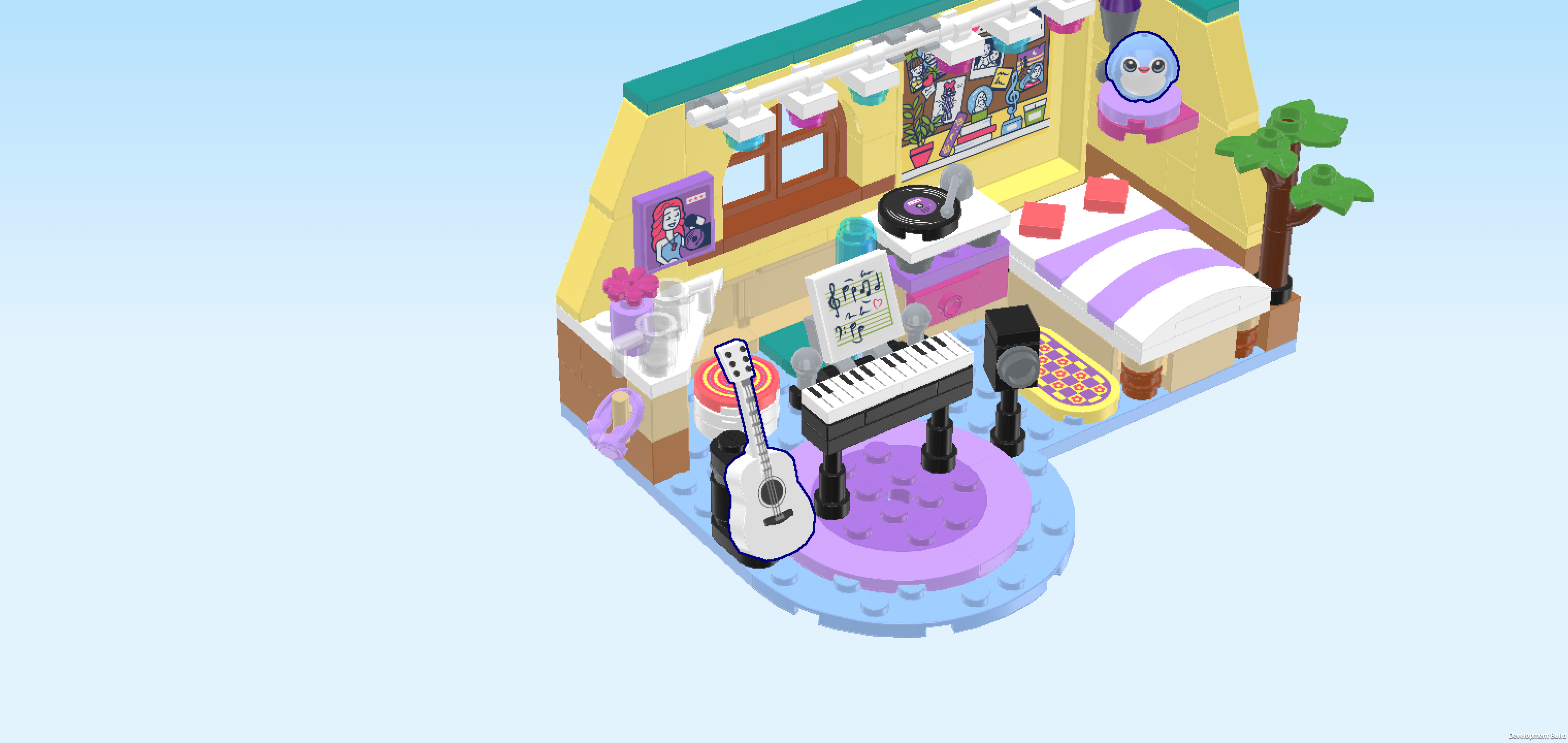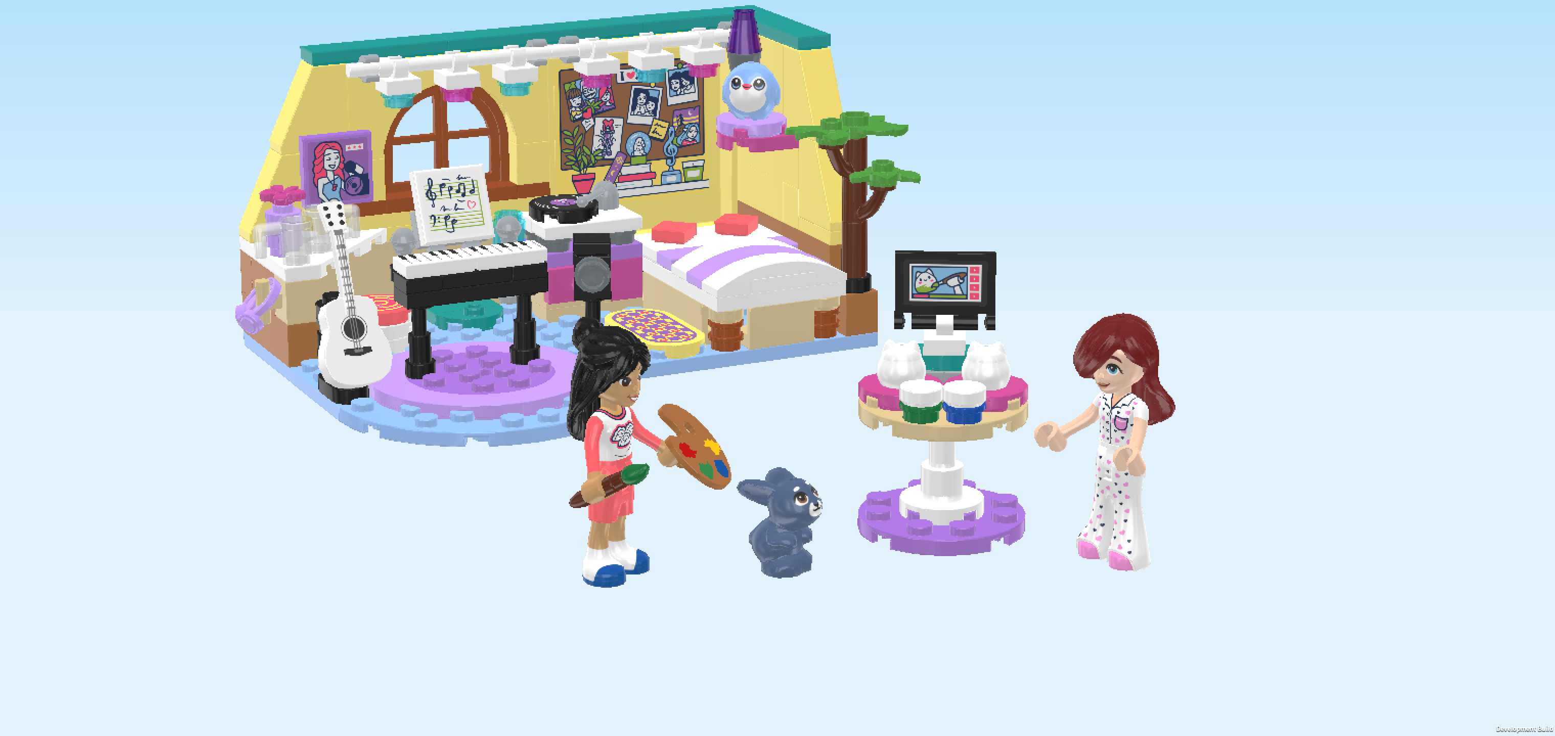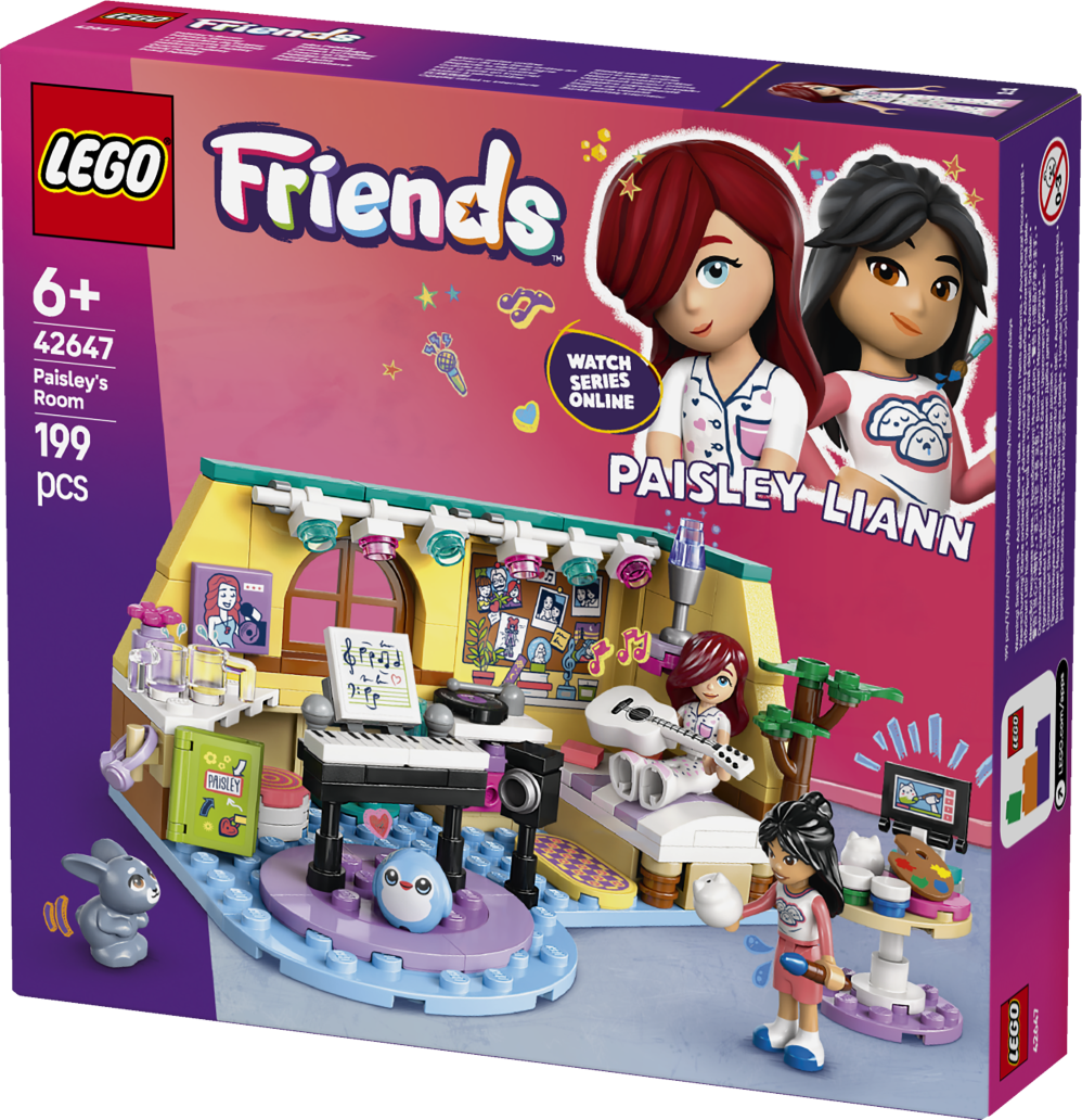The box cover shows a bright and playful bedroom built into a corner, where Paisley and Liann are spending time together. The two yellow walls meet in the back right corner and are covered with decorations, like drawings, photos, plants, and even a lava lamp, giving the room a cozy, creative feel. On the right side of the room, Paisley is sitting on her raised bed while strumming her beautiful all-white guitar. Liann is standing next to the bed, holding a paintbrush and a ceramic kitty-head figurine, ready to paint it. She is watching a video tutorial for creative ideas on how to paint her figurine! And guess what, both girls are in their pajamas! Looks like they are having a sleepover. How fun is that! In the middle of the room, there is a piano with sheet music. And underneath there’s a soft rug with Paisley's plushie. The back wall of the room is decorated with lovely string lights with blue and pink lights. This is the room of a music lover with a keen sense of aesthetics and lots of cherished friends. It's built for making music, creative painting sessions, and enjoying time with your friends. And now it’s your turn to build it!